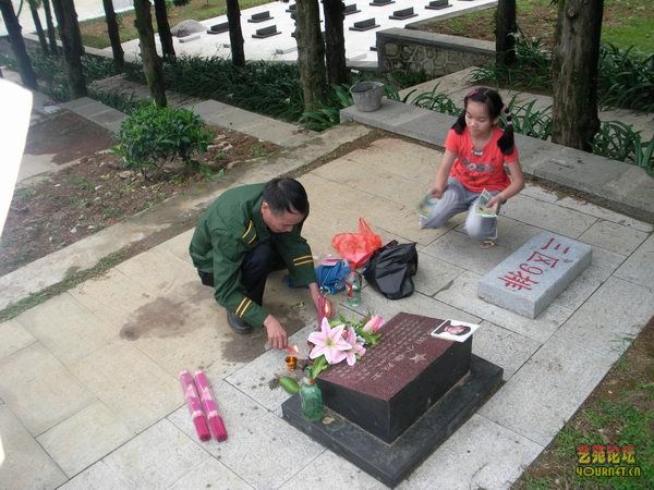在墓前的上香的一定是“五三零一八”,旁边的小姑娘是叶儿田田的小女儿,站着的是“宾山下来客”。而你在拍照。