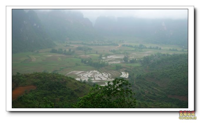 从硕龙向东南,来到某哨所。脚下是我们的边防哨所,远处开阔地是越方。